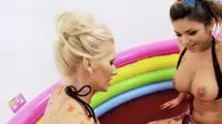 In this steamy porn video titled Blonde and Brunette Enjoy Tomatolicious Pleasures in an Inflatable Playground, the two stunning seductresses, the blonde and brunette, take turns teasing and pleasuring one another with their sultry and passionate embrace.They begin by playfully kissing under the inflatable pool, their tongues intertwining as they explore each others bodies with eager hands.As they continue to build their excitement, their fingers glide up and down, exploring the soft skin of their partner while teasing their clit, eliciting a moan from the receiver that sends shivers down the givers spine.The brunette then moves her mouth lower, delving into the blondes cunt with expert precision.Her tongue snakes through the wet folds of the blondes labia, lingering on her sensitive clit for maximum pleasure.Meanwhile, the blonde watches in awe as her girlfriend devours her with wild abandon.Their moans grow louder and more urgent as they continue to pleasure one another.In an erotic turn, the brunette hands over control to the blonde, who wastes no time in diving between her lovers legs, their lips meeting in a frenzied dance of passion.The taste of the other woman is intoxicating, and it doesnt take long for her fingers to join the fray, sliding through her dripping cunt as she works toward her climax with diligence and desire.Suddenly, the brunette craves something more.She reaches out and grabs a nearby dildo one shaped like a juicy tomato for maximum kinkiness.The two lovers gaze at each other with fiery eyes as they position themselves in preparation for their next adventure.The brunette straddles the blonde, who eagerly takes hold of her pliable toy, guiding it toward its destination with a steady hand and a knowing grin.The inflatable pools surface trembles beneath them as they grind themselves into each other, feeling their climax building in the pit of their stomachs.They continue to thrust and kiss, tongues meeting as if trying to create one more connection.The room fills with the echoes of their moans, and they grow louder as they near their orgasmic heights.As the brunette feels the wave crashing over her, she slides off of the blonde, unable to contain her ecstasy.They collapse on the inflatable playground, their bodies drenched in sweat and passion as they share a passionate kiss filled with the tang of tomato sauce lingering on their lips from their latest exploit.The two friends lay entwined, basking in the afterglow of their lovefilled adventure, already scheming their next exciting escapade.
